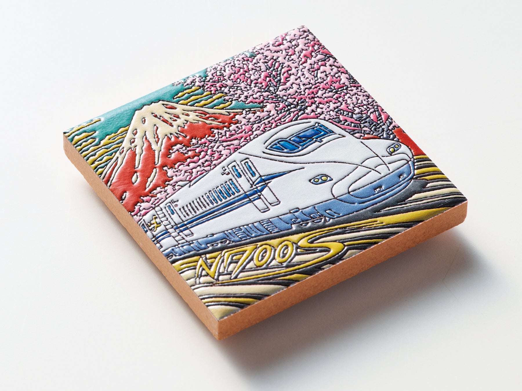 日本を象徴する桜の木と北斎の赤富士をオマージュとして取り入れたオリジナルデザインです。流れるような美しい車体フォルムと先頭部のシャープさを強調し、躍動感のある構図でのぞみが疾走する姿を表現しました。細部までこだわって立体化されたマグネットは、レールの先に広がる未来を想像させ、その凹凸を指でなぞるたびに、旅の記憶や心に残るひとときを思い出させてくれるはずです。(つちもちしんじ氏)