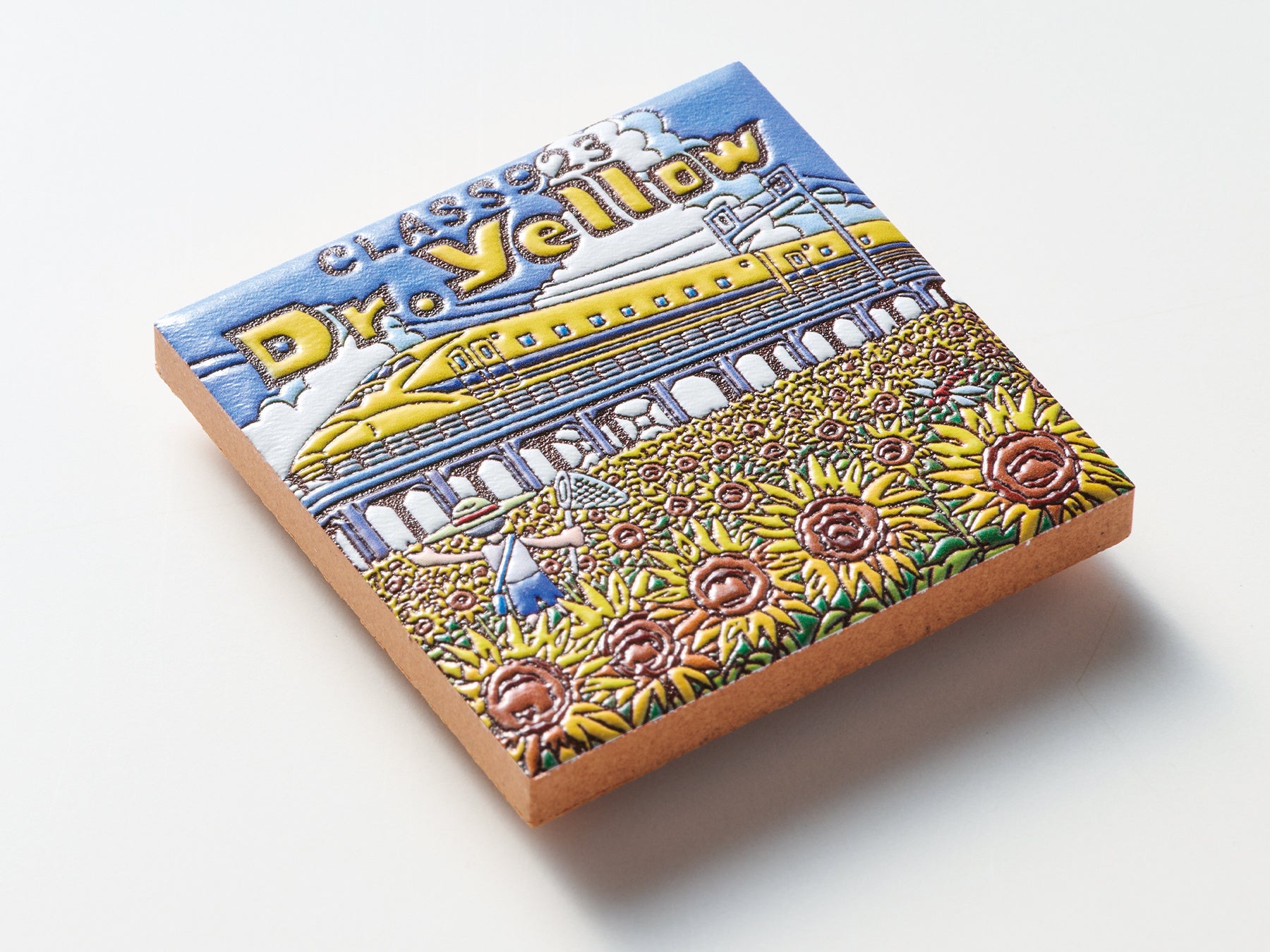 鮮やかな黄色の車体を最大限に引き立たせるため、夏の青空とひまわりを重ね合わせ、ドクターイエローが颯爽と走り抜ける姿を描きました。偶然その姿を目にしたときの胸の高鳴りを想像しながら描いた、まぶしい夏の日の情景を、細かい凹凸で浮かび上がるようにアレンジされたマグネットの中にそっと閉じ込めています。手に取るたびに、楽しい思い出がよみがえるような存在になれると嬉しいです。(つちもちしんじ氏)