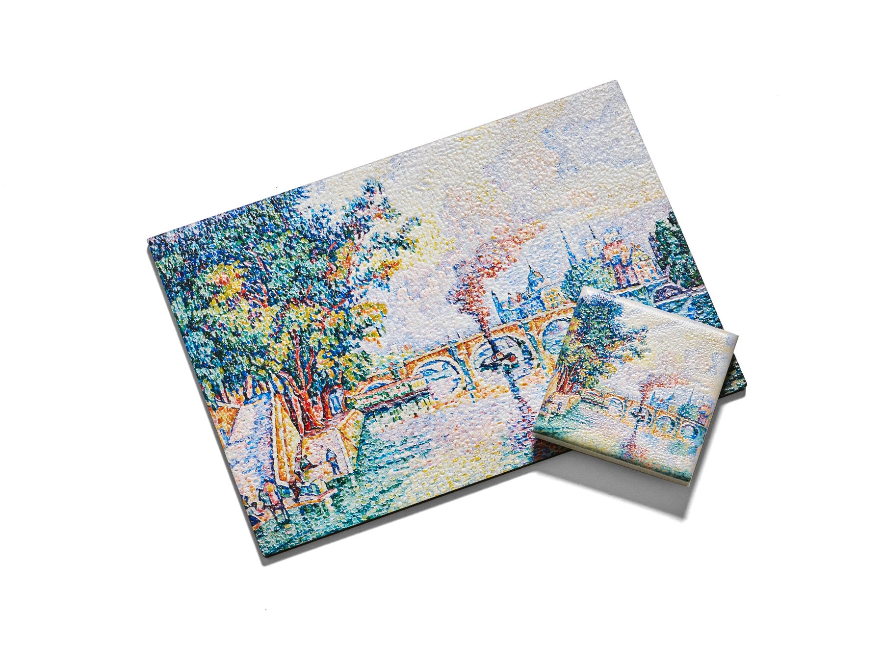 グッズ化に際して、シニャックの点描法で特徴的なタッチのひとつひとつに微細な凹凸を加えることで、実際の作品が持つ繊細で緻密な世界を表現することを目指しました。無数の色彩の点が並び、重なり合うことで生まれる色の広がりや、画面全体に流れる一定のリズムを忠実に再現しています。遠くから眺めるとひとつの風景としてまとまり、近くで見ると色と色の関係性が立ち上がる、そんな作品の魅力を、そのままポストカードとマグネットに閉じ込めました。シニャックが追求した洗練された色彩表現の世界を、指先で触れて感じていただけるアイテムです。