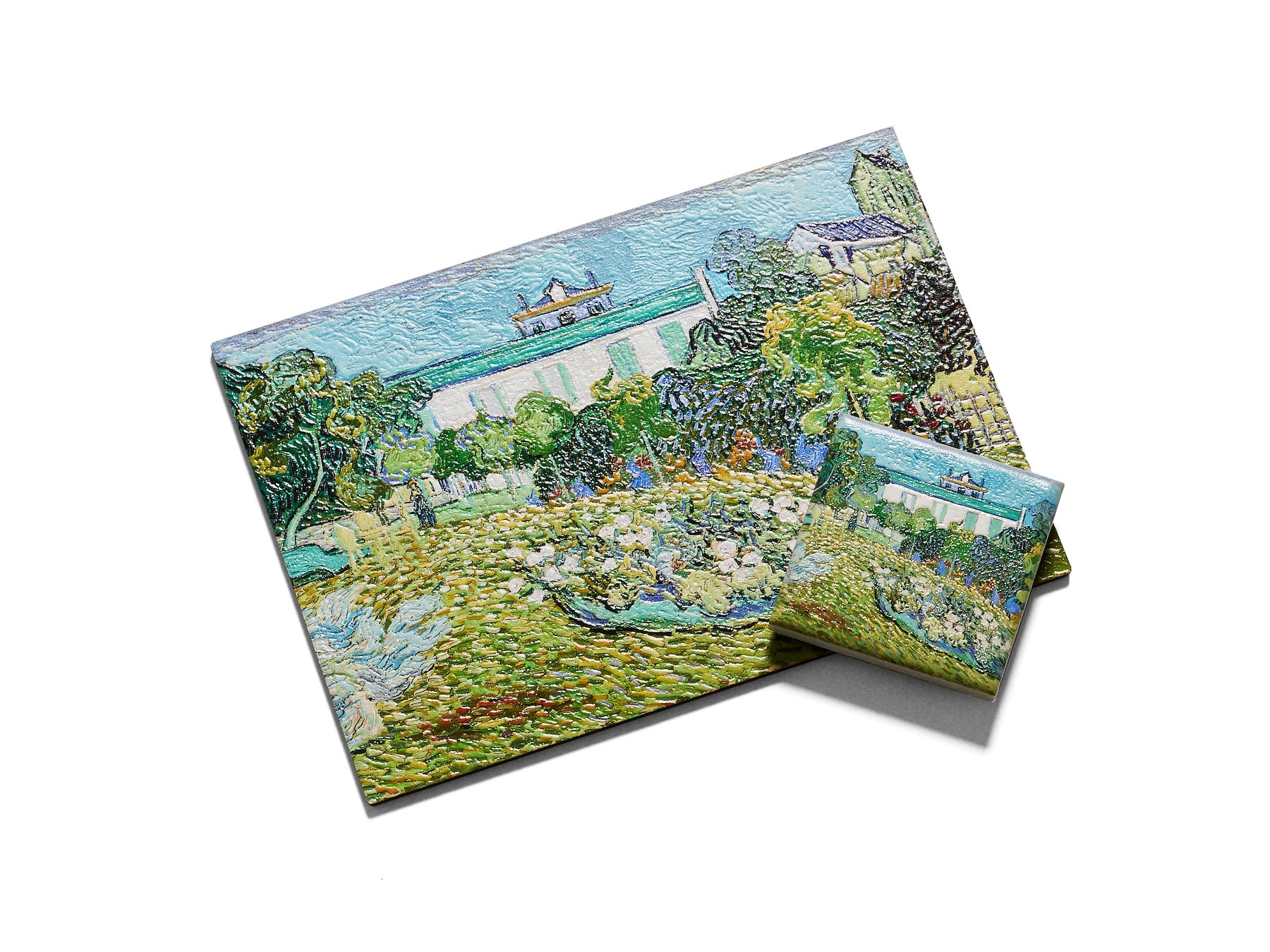 実際の作品では、細かくやや細長いタッチによって、生命力あふれる生い茂った草花が表現されています。グッズ化にあたり、その特徴的な厚みのあるタッチに着目し、草花や地面のうねりの細部にまで高低差のある凹凸加工を施し、ゴッホ特有のダイナミックな筆致や、絵の具の盛り上がりの質感を感じられる仕上がりにしました。静かな庭の情景でありながら、内に秘めたエネルギーを感じる作品の世界を、眺めるだけでなく、触れることでより深く味わえるポストカードとマグネットです。