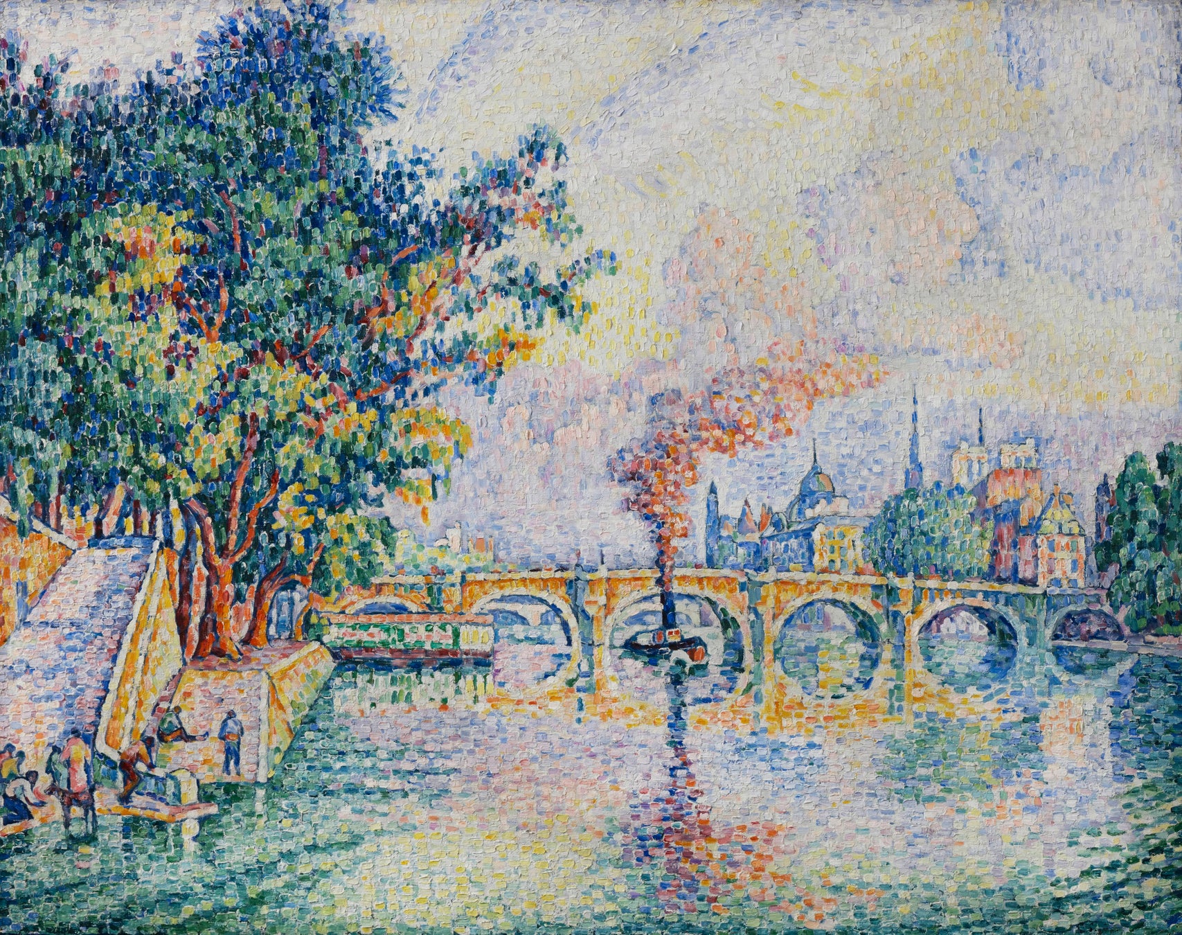 点描法で知られる新印象主義を代表する画家シニャックが描いた本作は、セーヌ河右岸からシテ島をのぞむ風景で、画面中央にはパリで最古の石橋であるポン=ヌフ(新橋の意)が横から捉えられています。シニャックはこの場所を繰り返し描いており、光、水面、都市のリズムが織りなすこの風景に、尽きることのない魅力を見出していたことがうかがえます。響き合う色彩の点によって、パリの空気そのものが画面に封じ込められたような作品です。